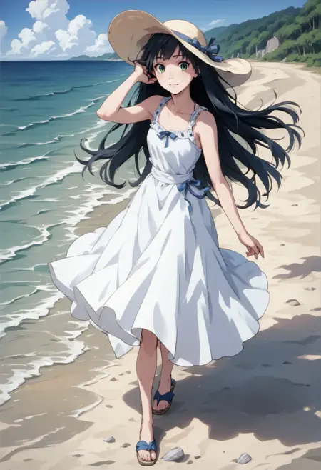 Notable tags: black hair, long hair, pendant, green eyes, white dress, long sleeves, wide sleeves, detached sleeves, bare shoulders, bridal gauntlets,