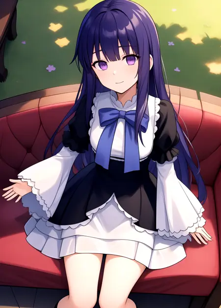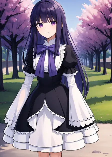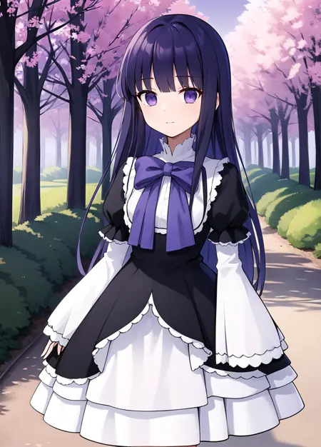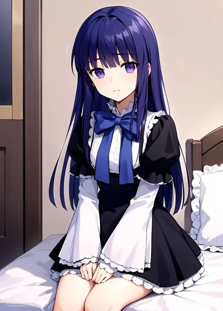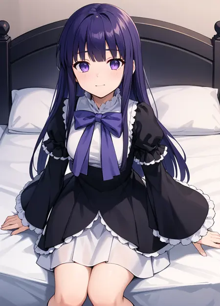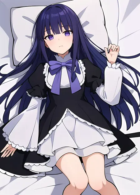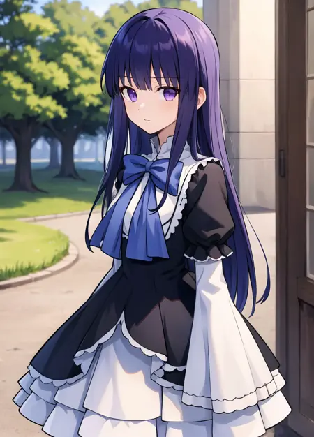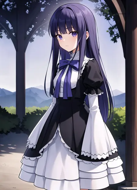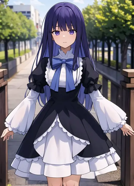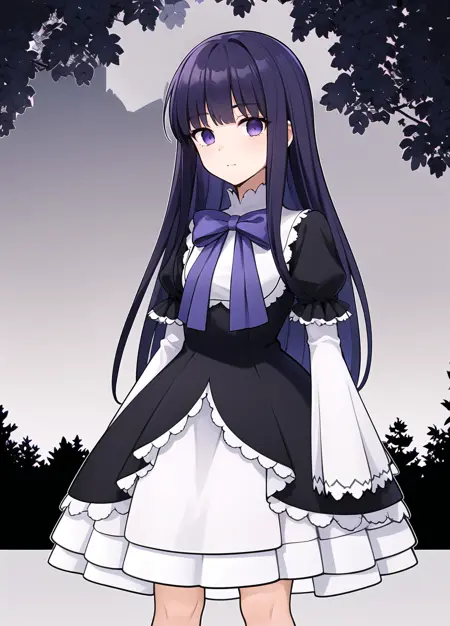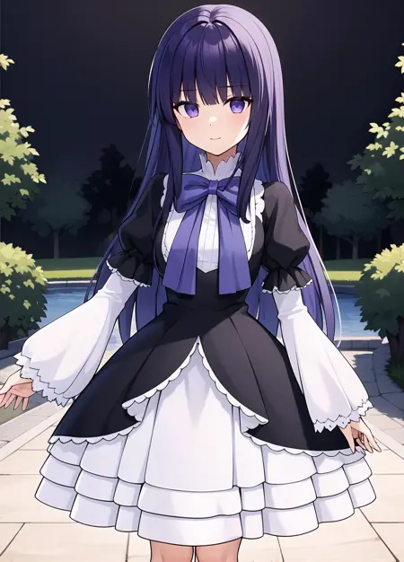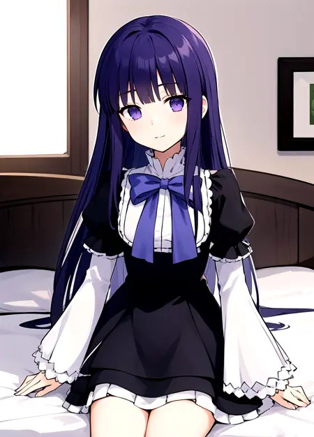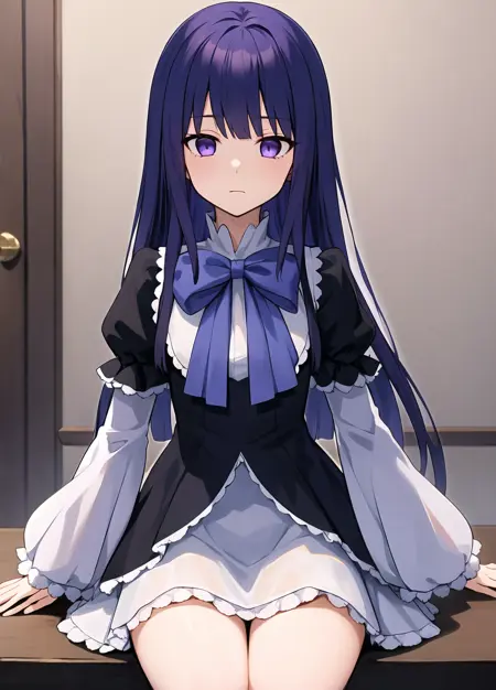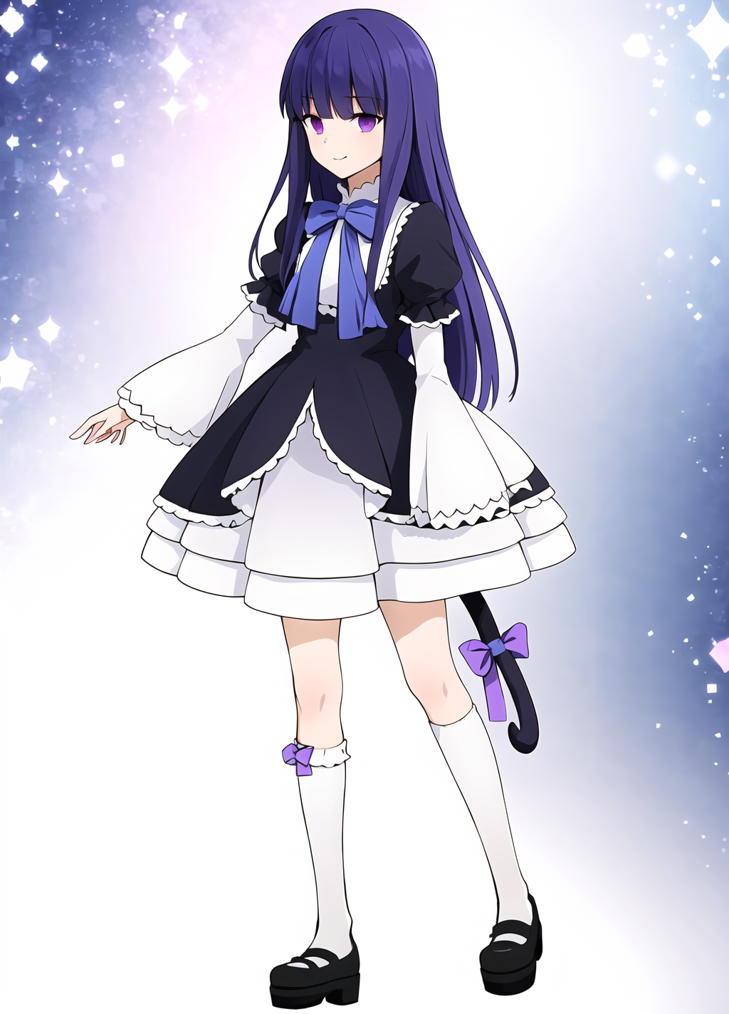 Trigger Words: frederica bernkastel, solo, 1girl, dress, long hair, blue hair, purple eyes, layered sleeves, long sleeves, bow, puffy sleeves, short over long sleeves, short sleeves, black dress, sleeves past wrists, frills, purple bow