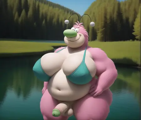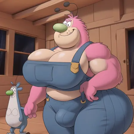 fuzzylumpkins, pink fur, green nose, blue overalls, antennae \(anatomy\),