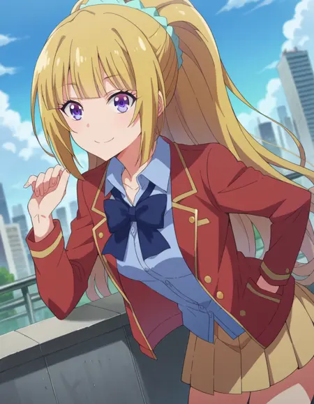 kei karuizawa, long hair, bangs, blunt bangs, purple eyes, blonde hair, shirt, hair ornament, ponytail, scrunchie, blue scrunchie