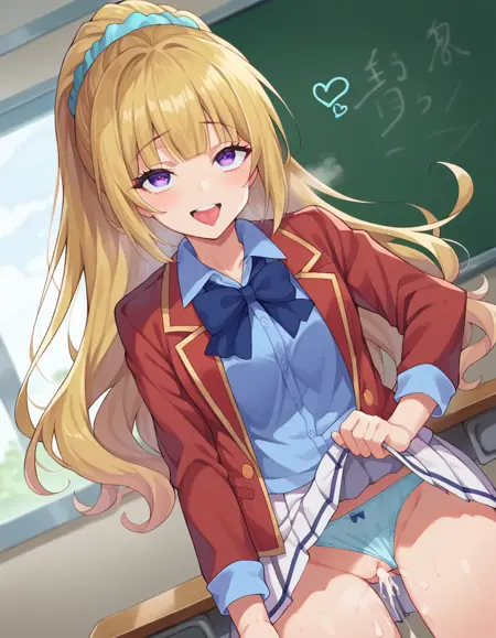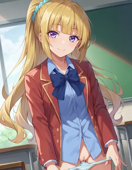 kei karuizawa, 긴 머리, 앞머리, 곧은 앞머리, 보라색 눈, 금발, 셔츠, 머리 장식, 말뚝머리, 스쿠نش, 푸른 스쿠unsch
