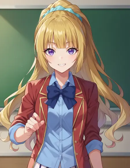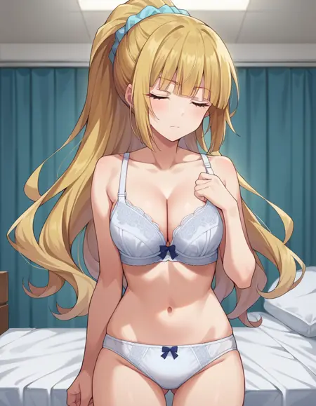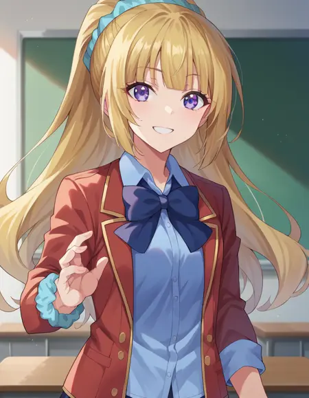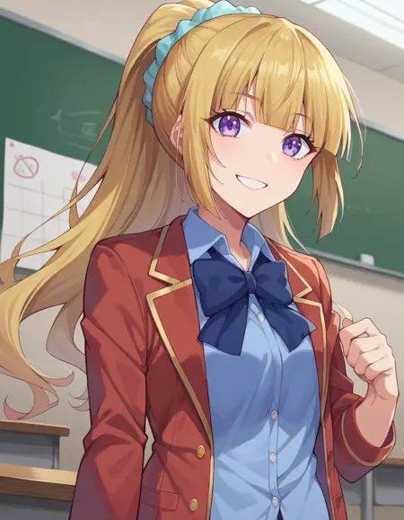 kei karuizawa, long hair, bangs, blunt bangs, purple eyes, blonde hair, shirt, hair ornament, ponytail, scrunchie, blue scrunchie