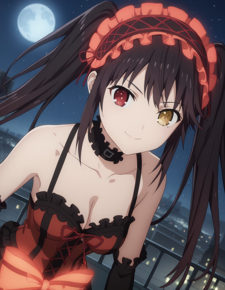 kurumi tokisaki 星空礼服,长发,黑发,红眼,双马尾,黄眼,发带,异色瞳,礼服,红礼服,露肩,锁骨,项圈,蝴蝶结,红蝴蝶结,分离袖,束腰,荷叶边,