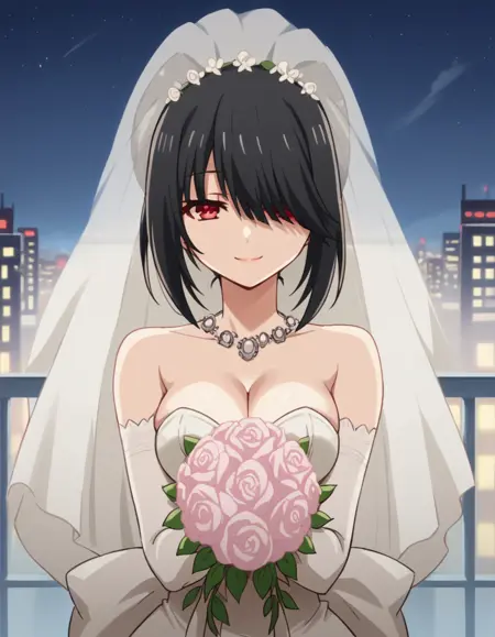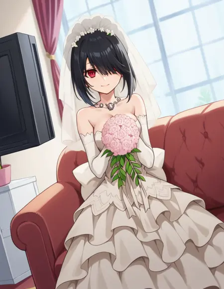 kurumi tokisaki astral 드레스, 긴 머리, 검은 머리, 붉은 눈, 트윈테일, 노란 눈, 헤어밴드, 이종 홍채, 드레스, 빨간 드레스, 어깨 노출, 쇄골, 초커, 폭스터, 빨간 폭스터, 분리된 소매, 코르셋, 프릴,