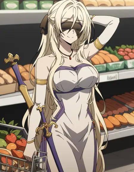 sword maiden, long hair, bangs, blonde hair, blindfold, covered eyes, black blindfold,