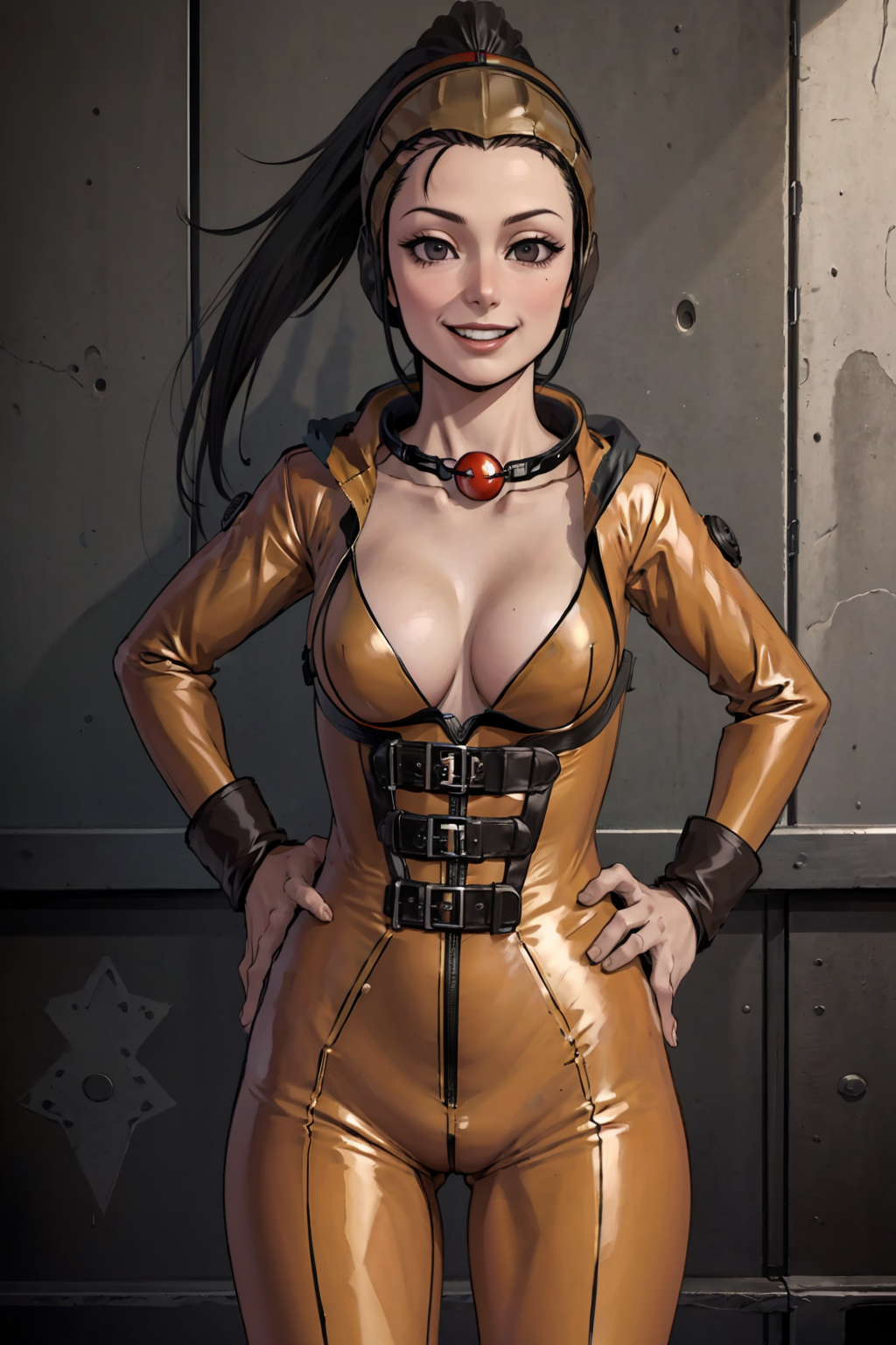 Base prompt is "MrsCooper". For her outfit "Bodysuit,orange bodysuit,cleavage,tattoo,cowl,ponytail".
