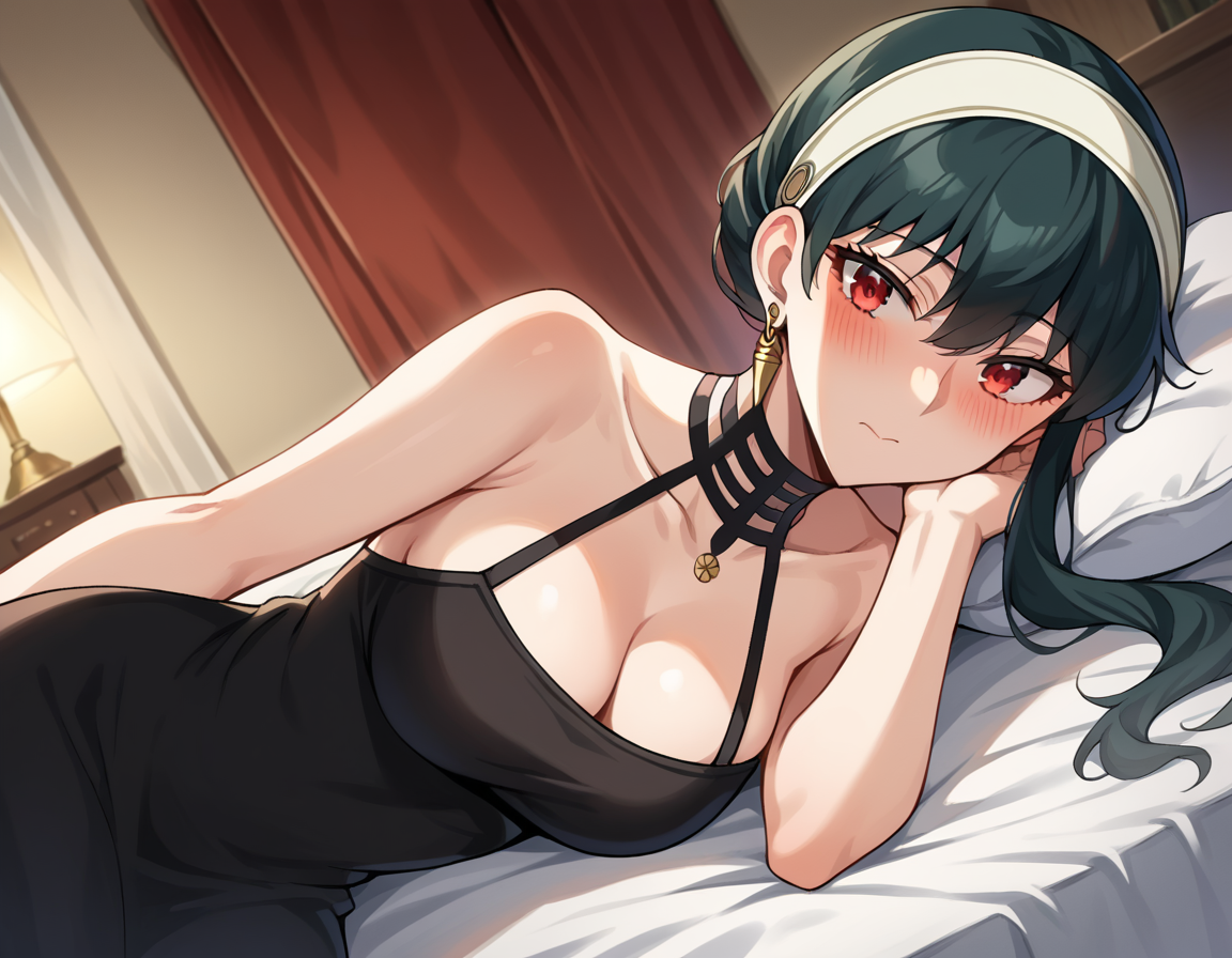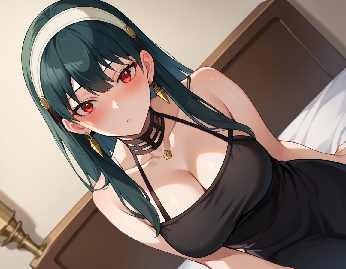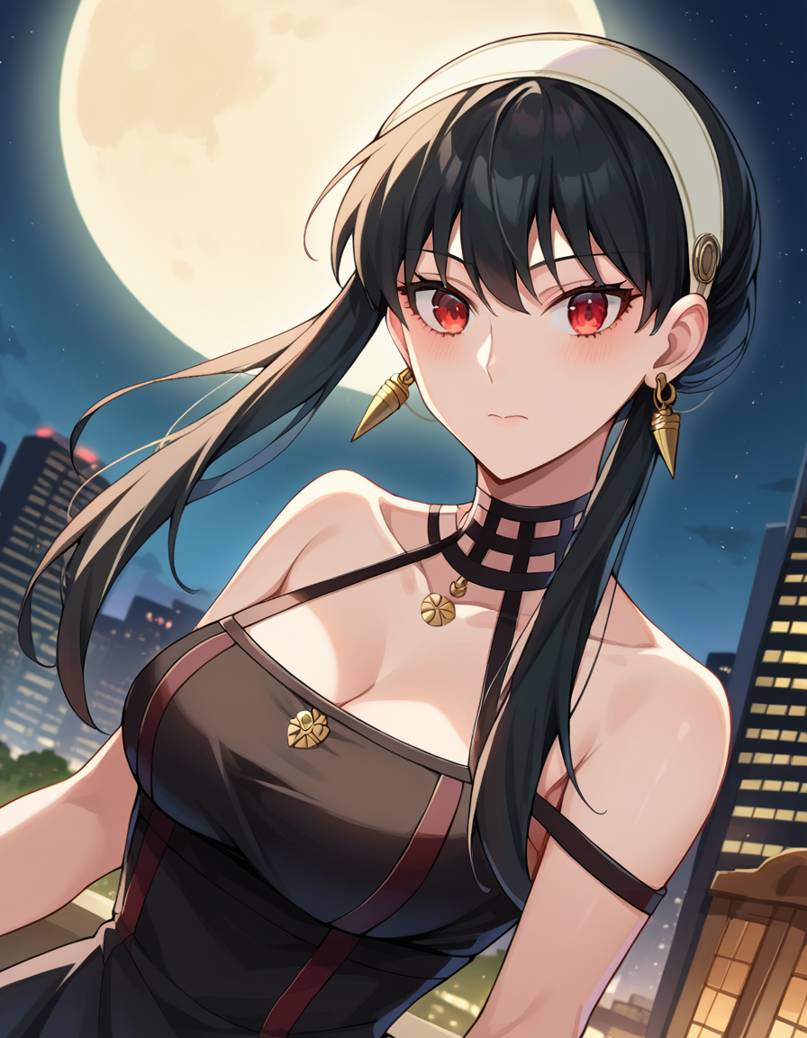 yor briar, black hair, red eyes, earrings, white hairband, hairband, long hair, sidelocks,