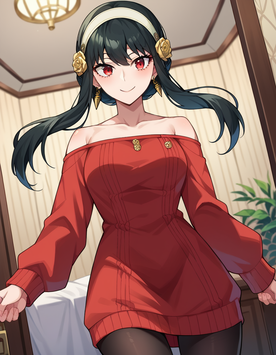 bare shoulders, collarbone, dress, long sleeves, off shoulder, off-shoulder dress, off-shoulder sweater, pantyhose, red sweater, sweater, sweater dress, thighs,