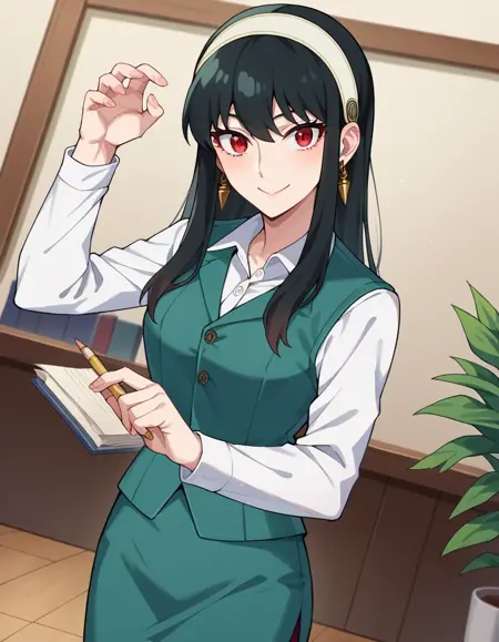 yor briar, black hair, red eyes, earrings, white hairband, hairband, long hair, sidelocks,