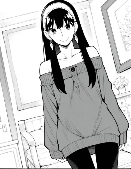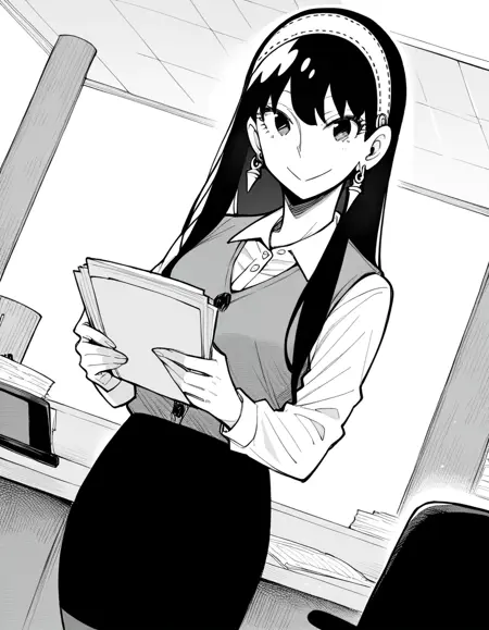 yor briar, black hair, red eyes, earrings, white hairband, hairband, long hair, sidelocks,