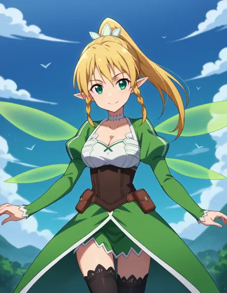 허벅지 양말, 가슴 노출, 날개, 녹색 드레스, 요정 날개, 요정, 여러 개의 날개, 펼쳐진 날개, 에너지 날개, 빛나는 날개, 녹색 날개,