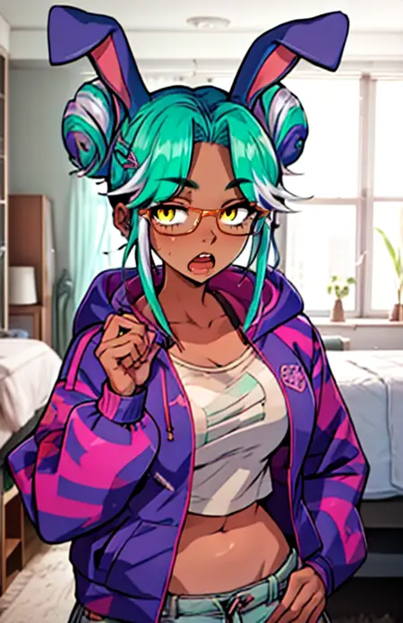 FuelVT, 1girl, short hair, shirt, pink hair, multicolored hair,, green hair, glasses,dark skin, streaked hair, dark-skinned femalesemi-rimless eyewear, red-framed eyewear, yellow eyes, , aqua hair,, hair ornament, piercing, hair bun, double bun