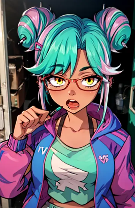 FuelVT, 1girl, short hair, shirt, pink hair, multicolored hair,, green hair, glasses,dark skin, streaked hair, dark-skinned femalesemi-rimless eyewear, red-framed eyewear, yellow eyes, , aqua hair,, hair ornament, piercing, hair bun, double bun