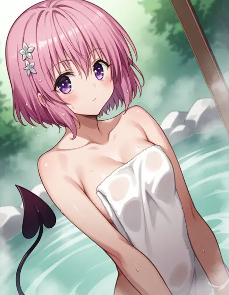 momo deviluke, 데몬 꼬리, 머리 꽃, 머리 장신구, 보라색 눈, 분홍색 머리, 단발, 꼬리,