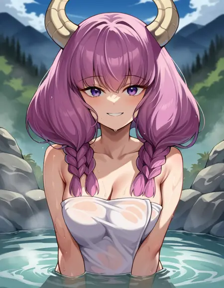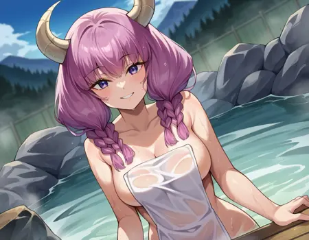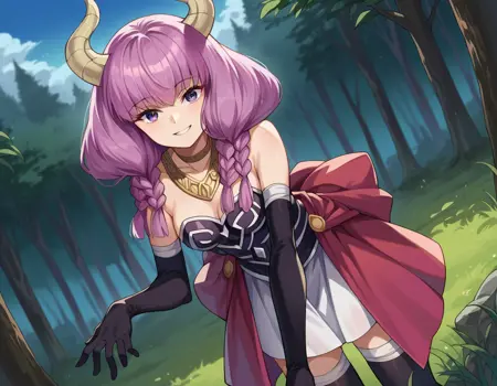 aura the guillotine, long hair, purple eyes, purple hair, braid, horns, twin braids,