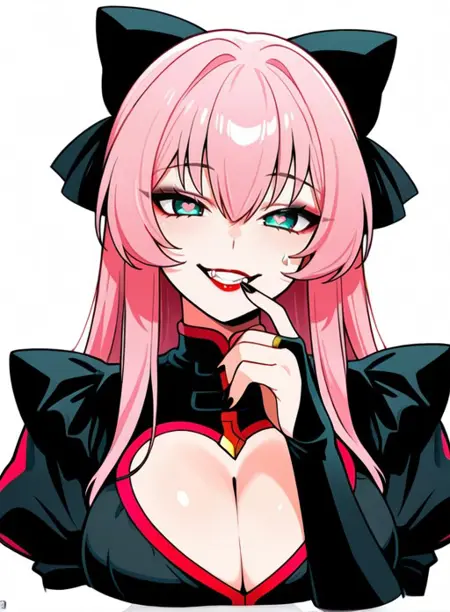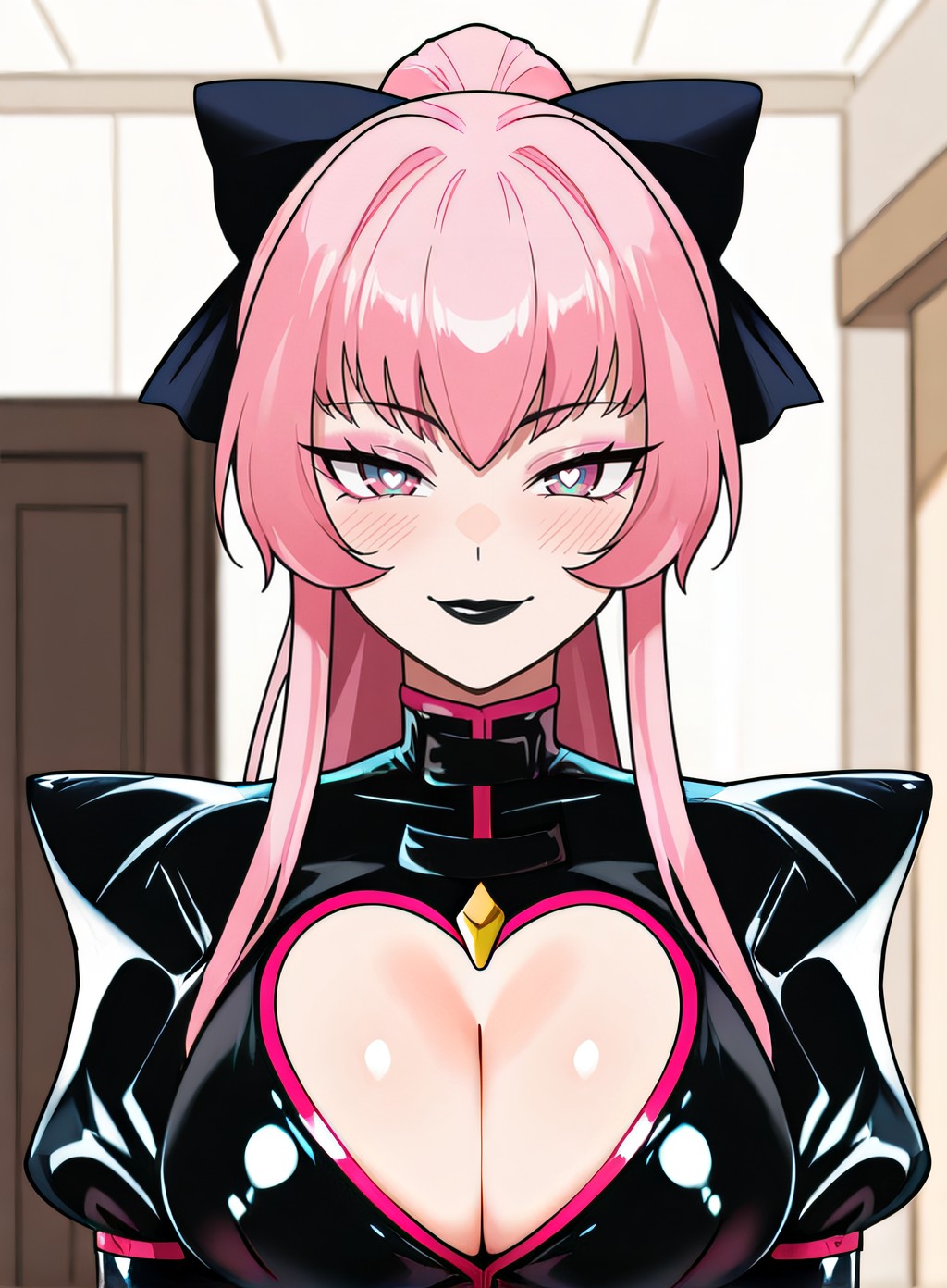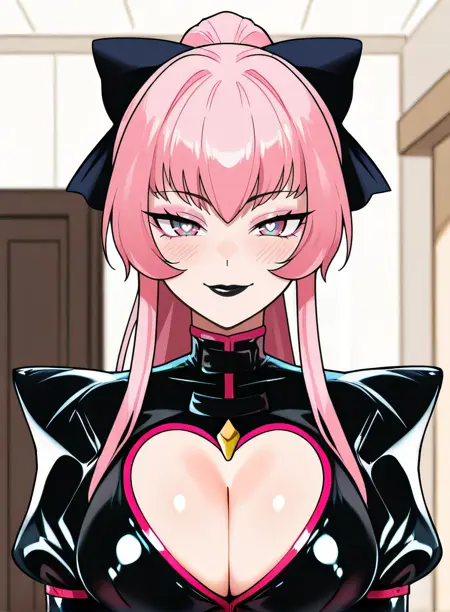 CondesaVR,long hair, breasts, blue eyes, large breasts, pink hair, heart, pink eyes, makeup, heart-shaped pupils, eyeshadow, multicolored eyes, pink eyeshadow, black lips,hair bow, ponytail,