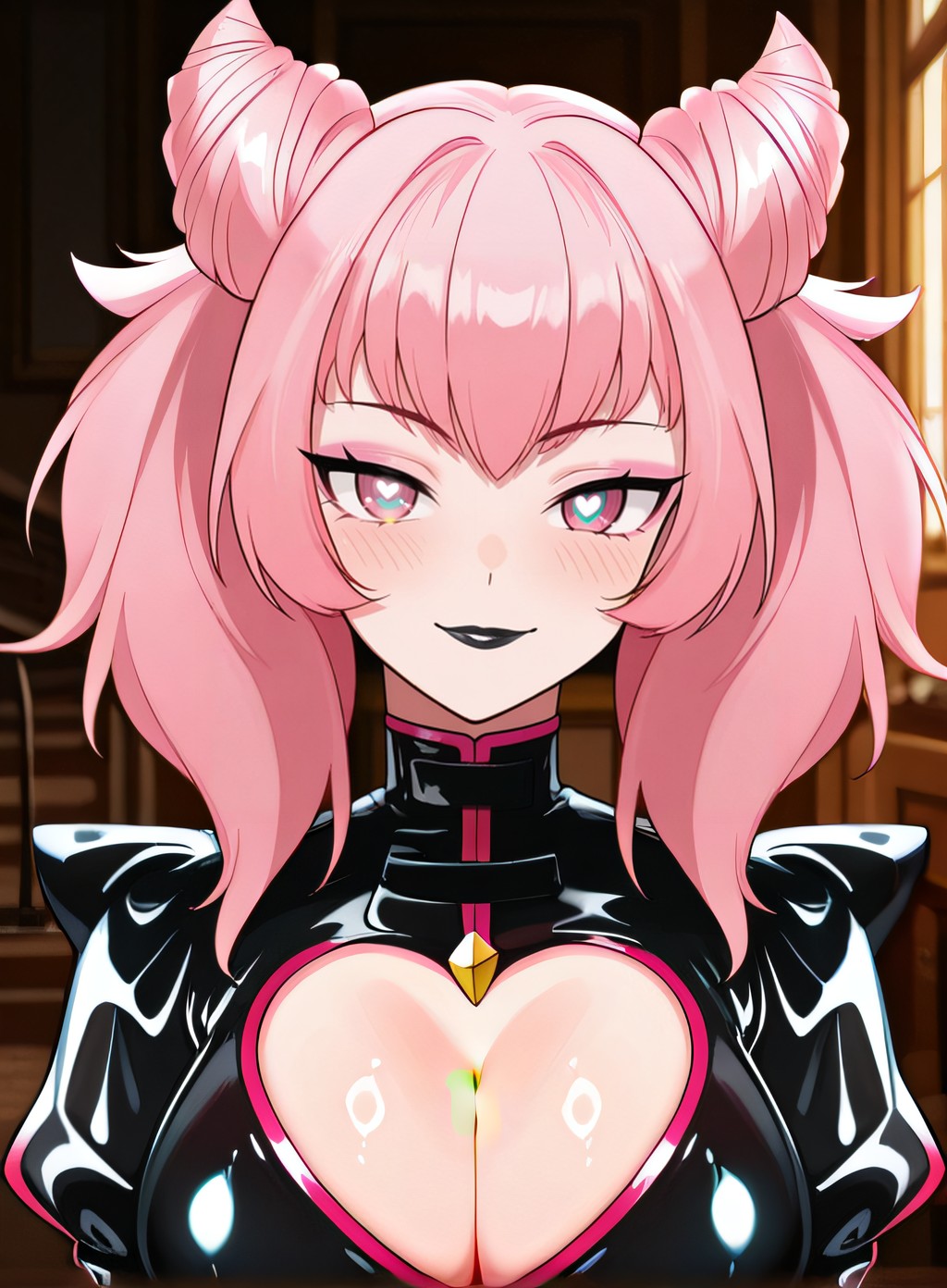 CondesaVR,long hair, breasts, blue eyes, large breasts, twintails, pink hair, heart, pink eyes, hair bun, makeup, heart-shaped pupils, eyeshadow, multicolored eyes, cone hair bun, hair horns, pink eyeshadow, black lips