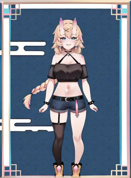 DevaOgami、1人女の子、シングル、長い髪、胸、大きな胸、金色の髪、ピンクの髪、多色の髪、角、チョーカー、鬼、ストライプ髪、大きな胸、中くらいの髪、青い目、髪飾り、x髪飾り、花のタトゥー、バーチャルユーチューバー、勾玉