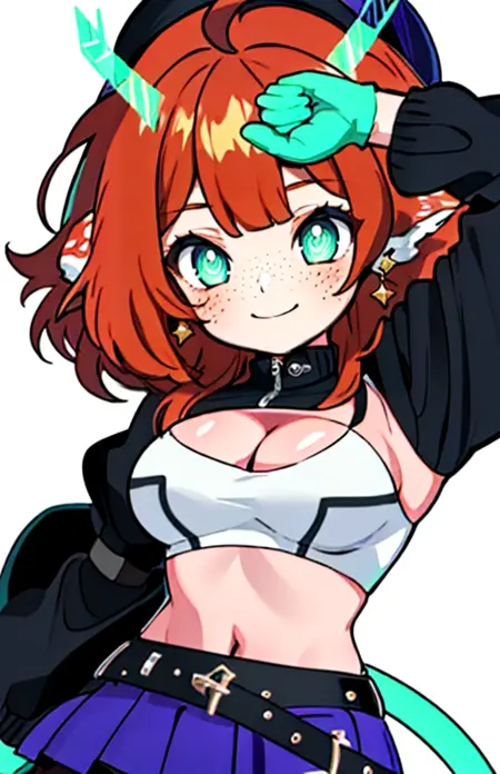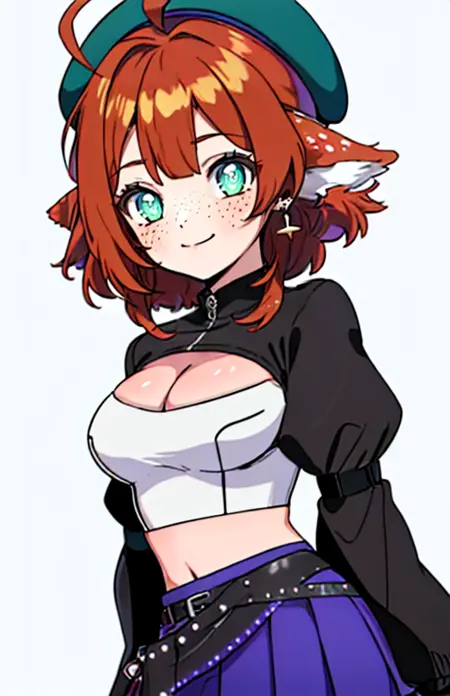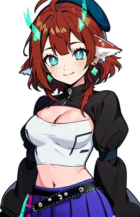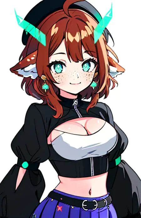 HarperStrikesVT, 1girl, solo, breasts, short hair, blue eyes, large breasts, brown hair, animal ears, medium breasts, green eyes, tail, braid, horns, virtual youtuber, medium hair, orange hair,aqua eyes, green horns,deer tail,