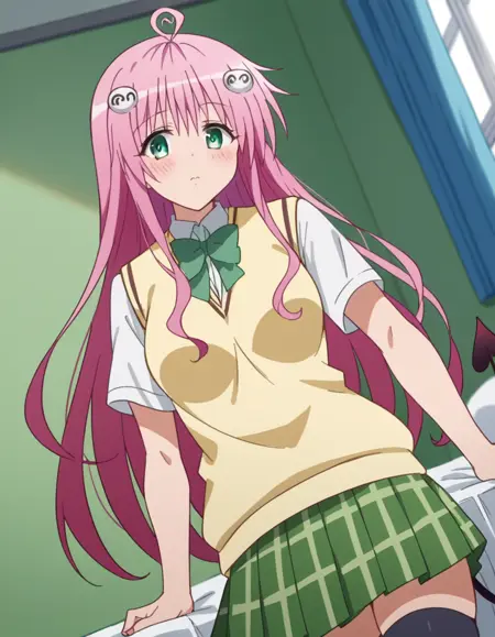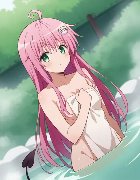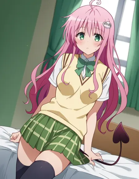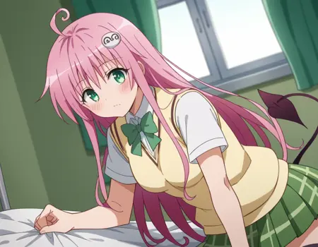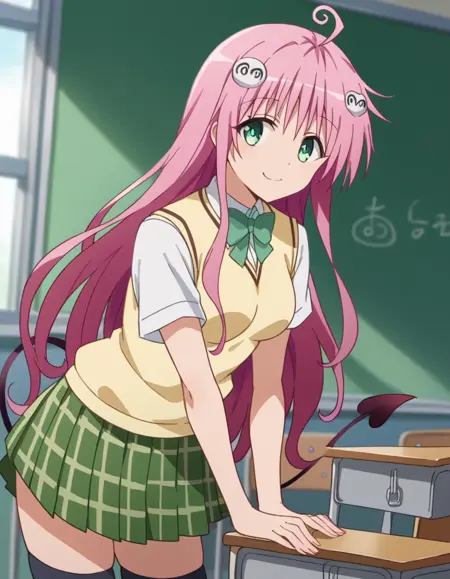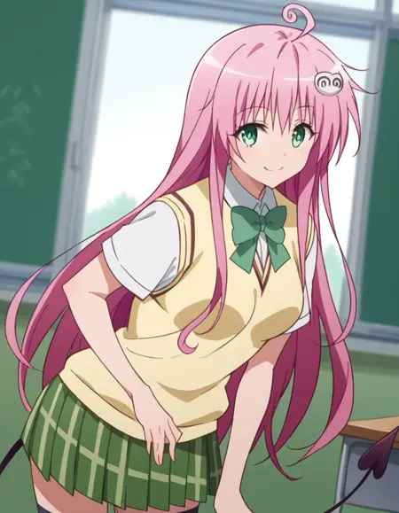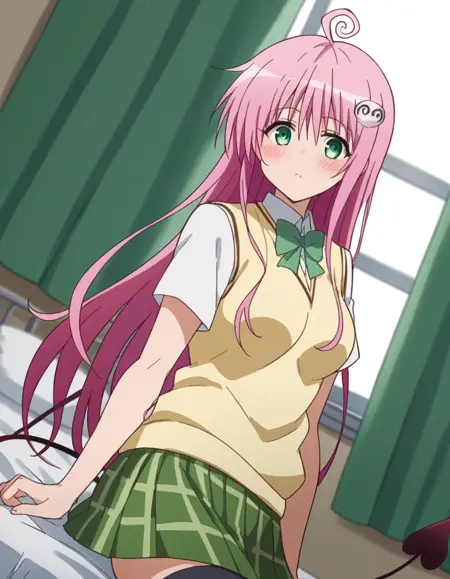 lala deviluke, long hair, pink hair, tail, ahoge, bangs, hair ornament, green eyes,