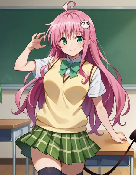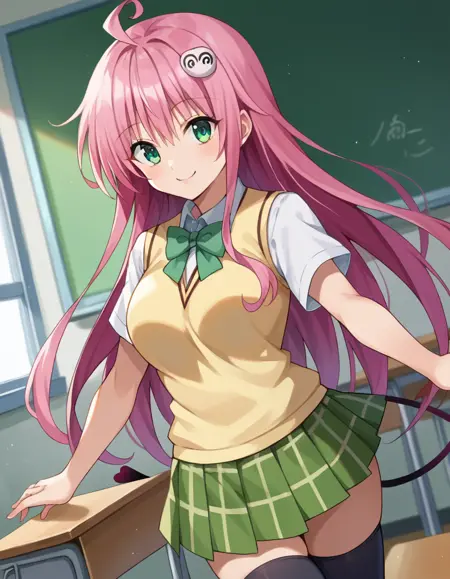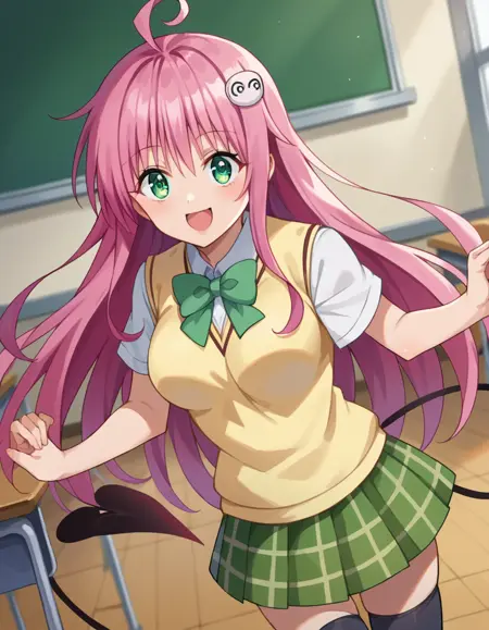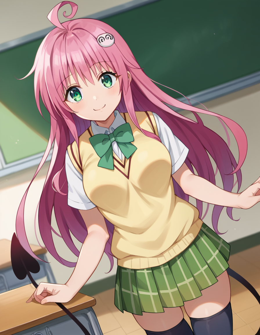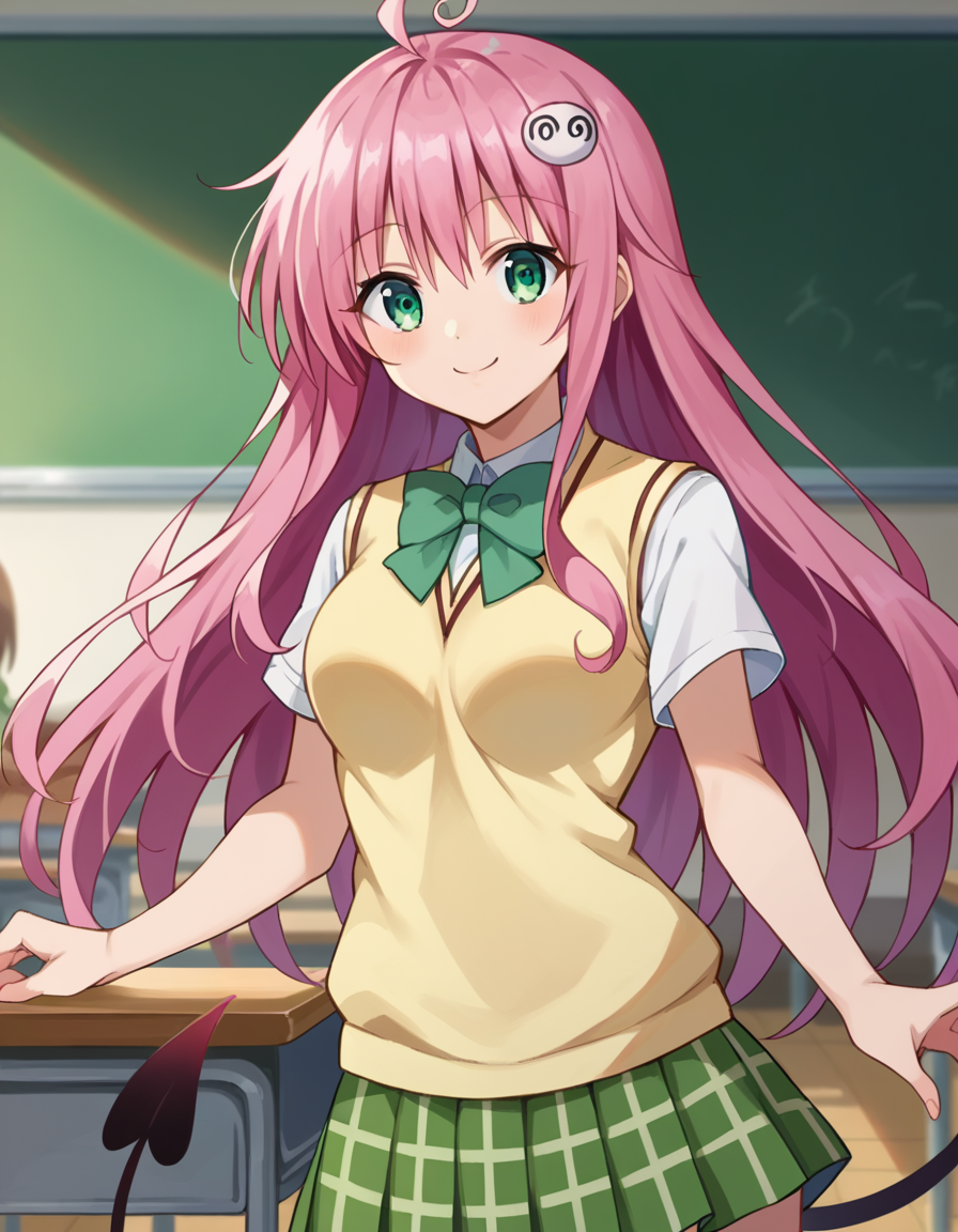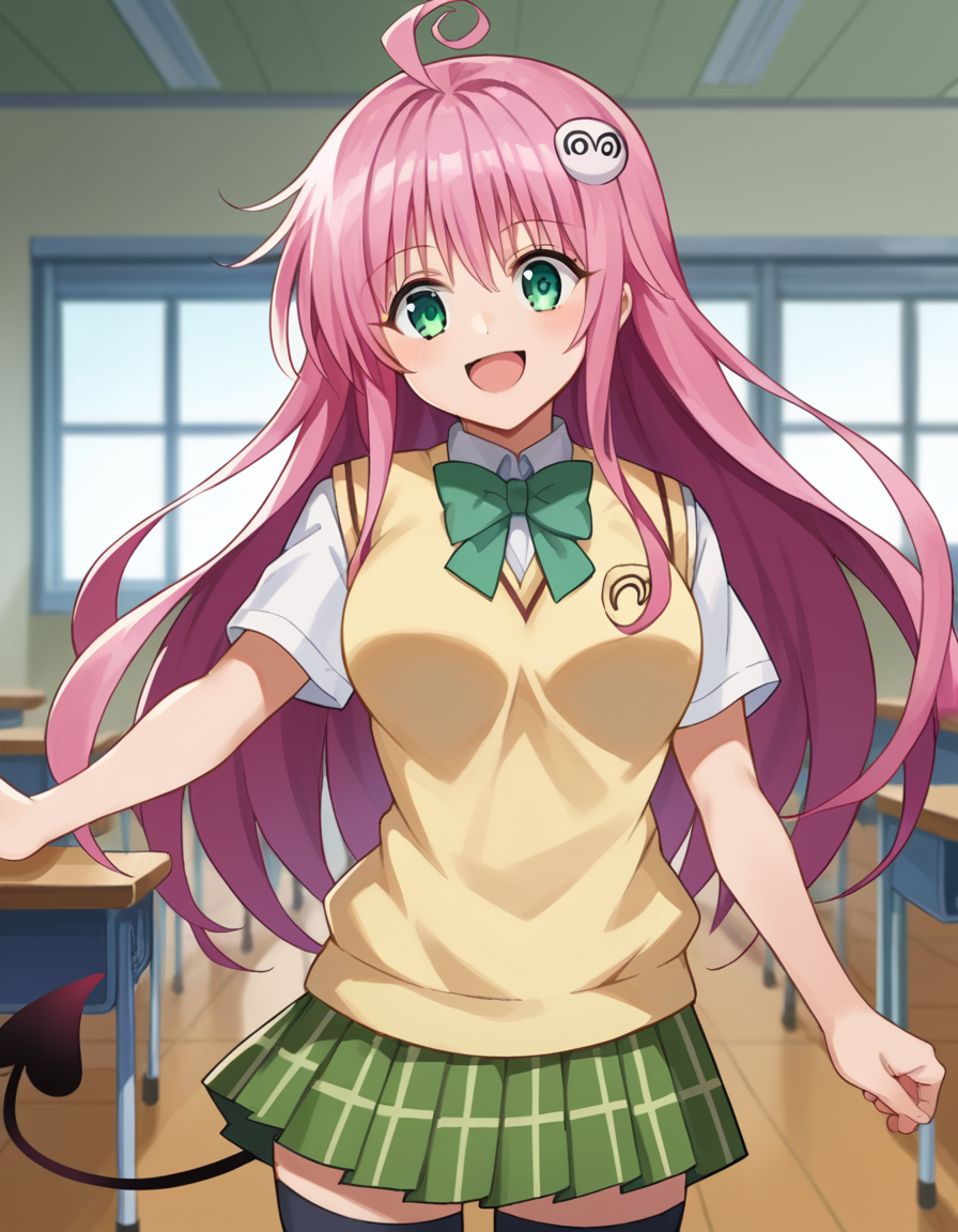lala deviluke, long hair, pink hair, tail, ahoge, bangs, hair ornament, green eyes,