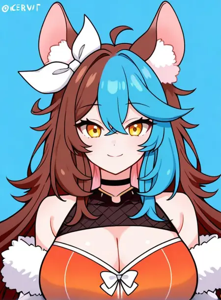 KeirameVT, 1girl, solo, long hair, breasts, lsmile, large breasts, animal ears, ribbon, ,blue hair, yellow eyes, ahoge, hair ribbon, multicolored hair,, virtual youtuber, , two-tone hair, animal ear fluff,, black choker, white ribbon,, bow, hair between eyes, hair bow, white bow, brown hair, mouse ears,