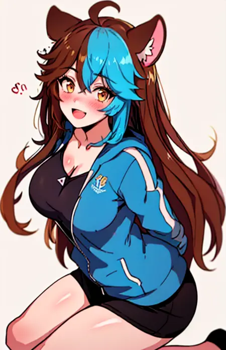 KeirameVT, 1girl, solo, long hair, breasts, lsmile, large breasts, animal ears, ribbon, ,blue hair, yellow eyes, ahoge, hair ribbon, multicolored hair,, virtual youtuber, , two-tone hair, animal ear fluff,, black choker, white ribbon,, bow, hair between eyes, hair bow, white bow, brown hair, mouse ears,