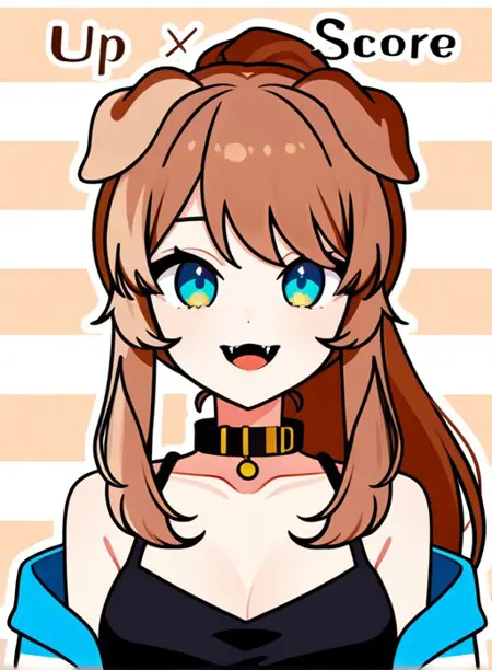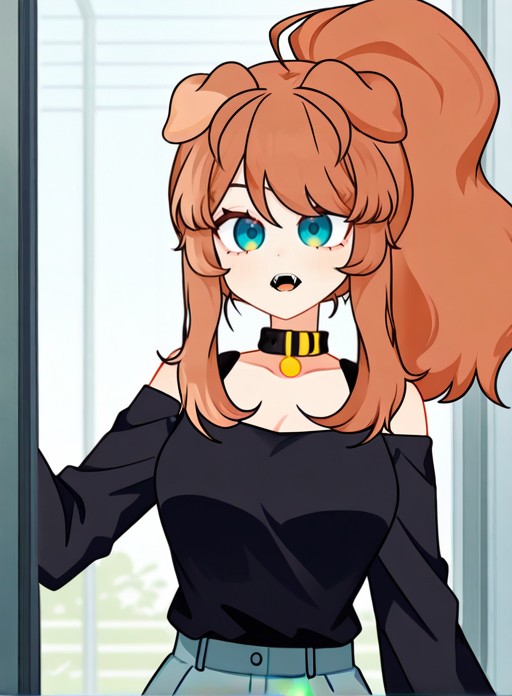LilyBell_VT, long hair, breasts, blue eyes, brown hair, animal ears, medium breasts, ponytail, sidelocks, choker, collar, fangs, dog ears, eyebrows hidden by hair, dog girl, s black collar, hair ornament,