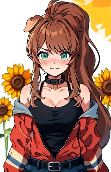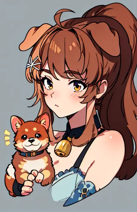 LilyBell_VT, long hair, breasts, blue eyes, brown hair, animal ears, medium breasts, ponytail, sidelocks, choker, collar, fangs, dog ears, eyebrows hidden by hair, dog girl, s black collar, hair ornament,