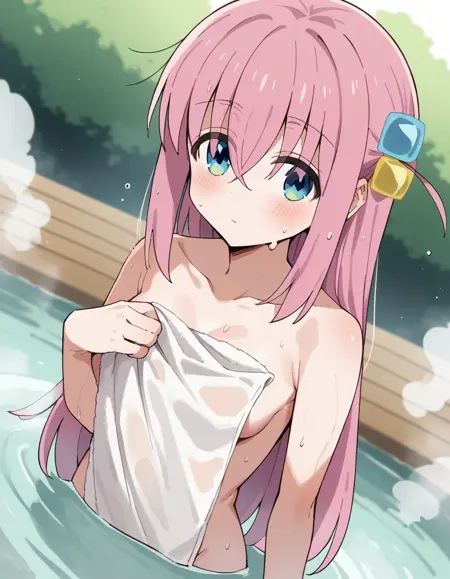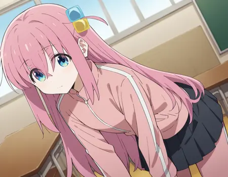 hitori gotou, 青い目, 立方体の髪飾り, 目の間の髪, 髪飾り, ピンクの髪, 片方だけ上げる, 長い髪,