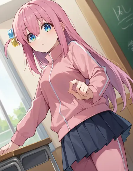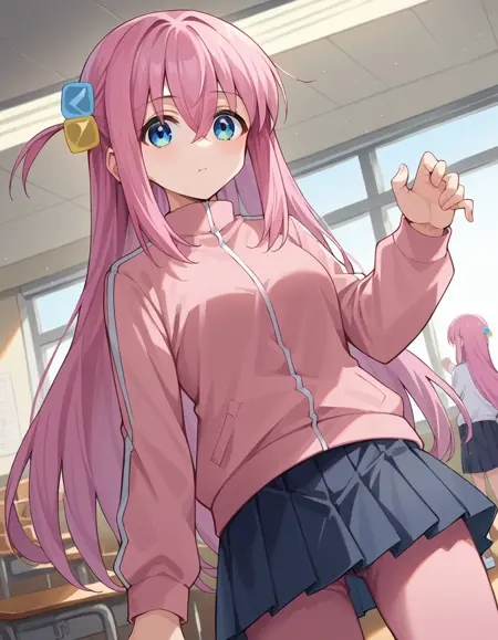 hitori gotou, blue eyes, cube hair ornament, hair between eyes, hair ornament, pink hair, one side up, long hair,