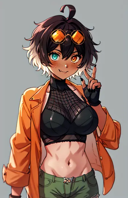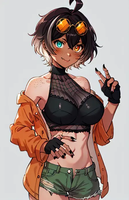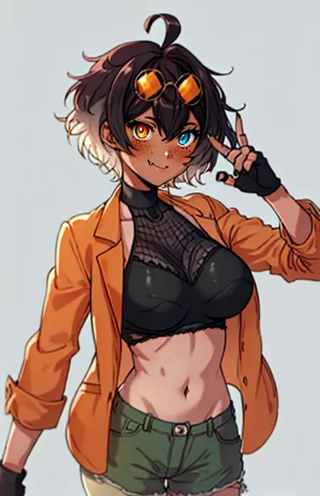 Mari_Nanjo, breasts, short hair, large breasts, brown hair,hair between eyes, yellow eyes, ahoge, multicolored hair, glasses, virtual youtuber, black thighhighs, midriff, dark skin, two-tone hair, dark-skinned female, orange eyes, sunglasses, eyewear on head, tanlines, borrowed character, tinted eyewear, , orange-tinted eyewear, heterochromia, blue eyes,