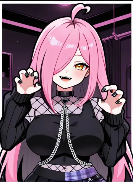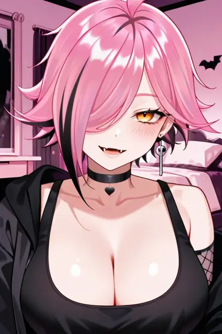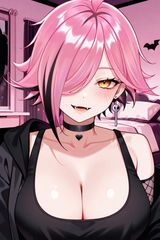 NeneEfthy, breasts, large breasts, black hair, cleavage, jewelry, yellow eyes, pink hair, multicolored hair, heart, earrings, choker, indoors, fang, , hair over one eye, streaked hair, orange eyes, black choker, fangs, short hair, makeup,