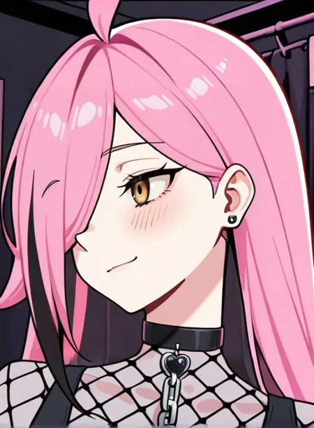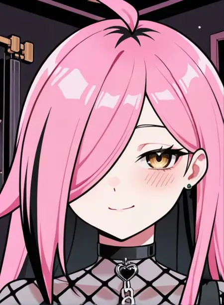 NeneEfthy, long hair, breasts, large breasts, brown eyes, yellow eyes, pink hair, multicolored hair, heart, earrings, choker, hair over one eye, collar,black choker, one eye covered,heart choker, heart collar, black hair,ahoge