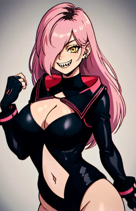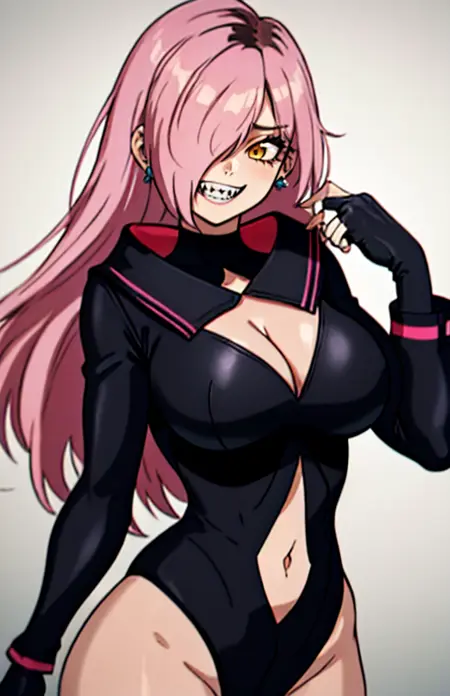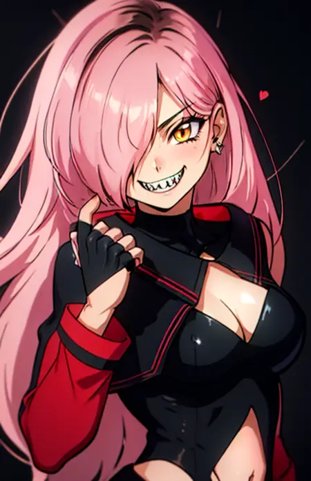 NeneEfthy, breasts, large breasts, black hair, cleavage, jewelry, yellow eyes, pink hair, multicolored hair, heart, earrings, choker, indoors, fang, , hair over one eye, streaked hair, orange eyes, black choker, fangs, short hair, makeup,