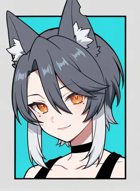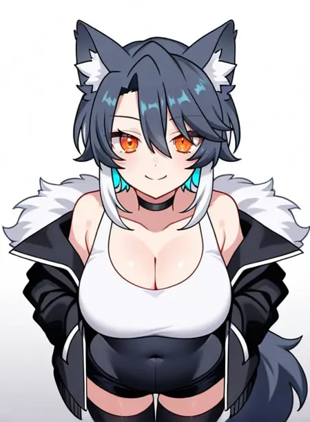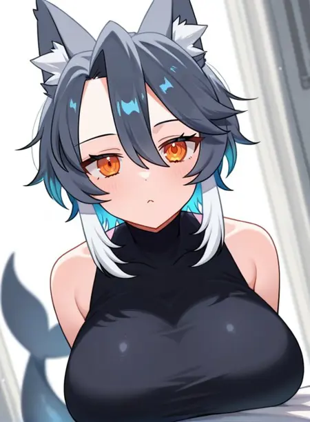 yuunkurosu, breasts,short hair, large breasts, animal ears, hair between eyes, blue hair, white hair, multicolored hair, animal ear fluff, orange eyes , wolf ears, wolf girl, tail, virtual youtuber, cat ears, large breasts, fish tail,