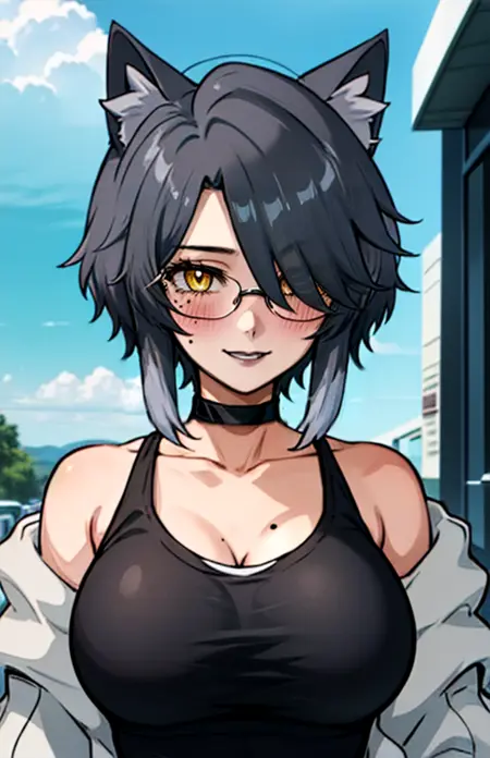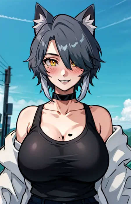 yuunkurosu, breasts,short hair, large breasts, animal ears, hair between eyes, blue hair, white hair, multicolored hair, animal ear fluff, orange eyes , wolf ears, wolf girl, tail, virtual youtuber, cat ears, large breasts, fish tail,