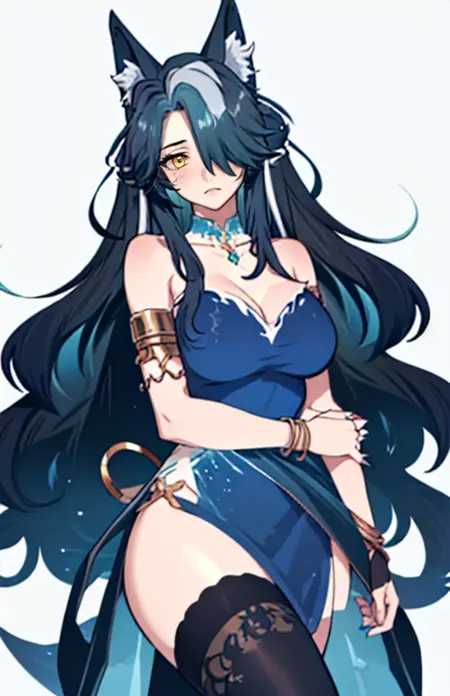 yuunkurosu, breasts,short hair, large breasts, animal ears, hair between eyes, blue hair, white hair, multicolored hair, animal ear fluff, orange eyes , wolf ears, wolf girl, tail, virtual youtuber, cat ears, large breasts, fish tail,