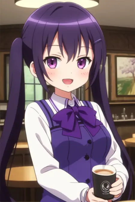rabbit house uniform, collared shirt, shirt, white shirt, purple vest, purple bow, bow, vest, hair ornament, hairclip, long sleeves, purple bowtie, bowtie, wing collar, buttons