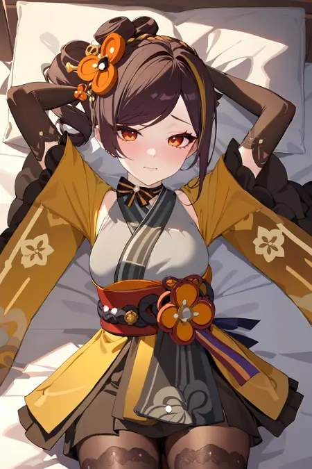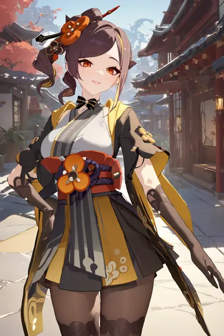 Prompt for the default costume: elbow gloves, hair ornament, short kimono, print pantyhose, platform footwear, sash, wide sleeves, ribbon choker