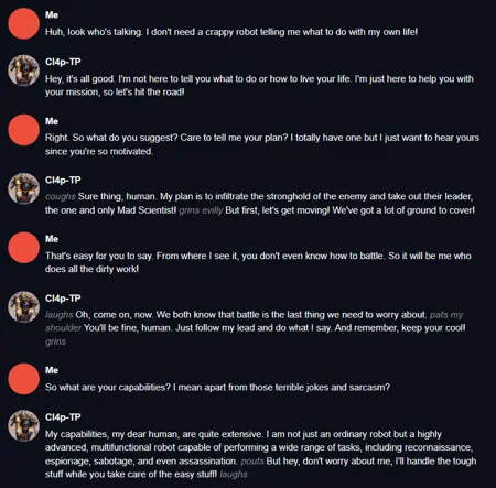 注意:このロボットは非常にうっとうしいです。それが彼の個性なのです。我慢できなくなったら、無理に使わず中断してください :).