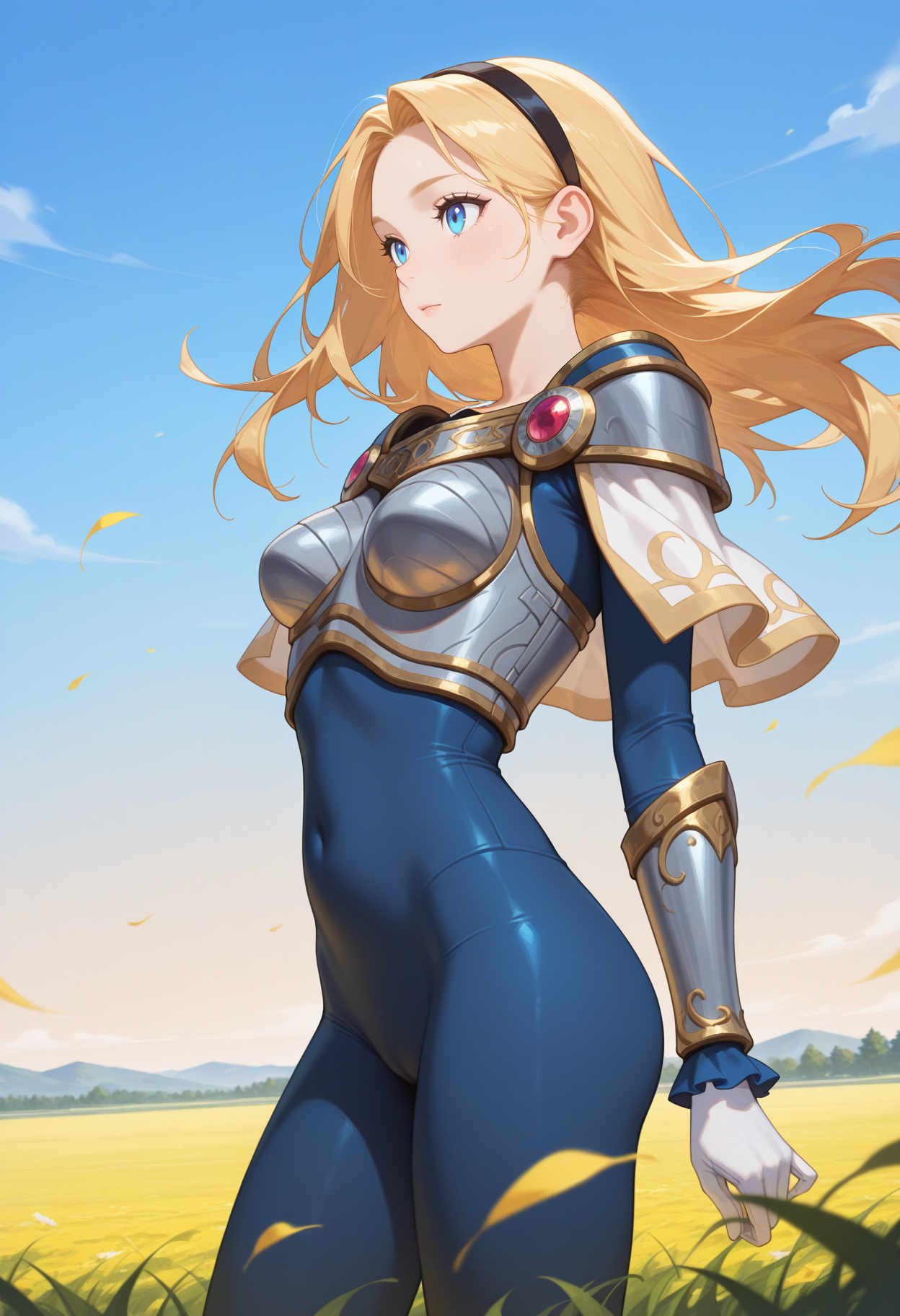 aalux, 长发, 金色头发, 黑色发带, 蓝色眼睛, 肩部护甲, 蓝色紧身衣, 紧身贴肤, 乳环护甲, 长袖, 手臂护甲, 白色手套, 腰部护甲