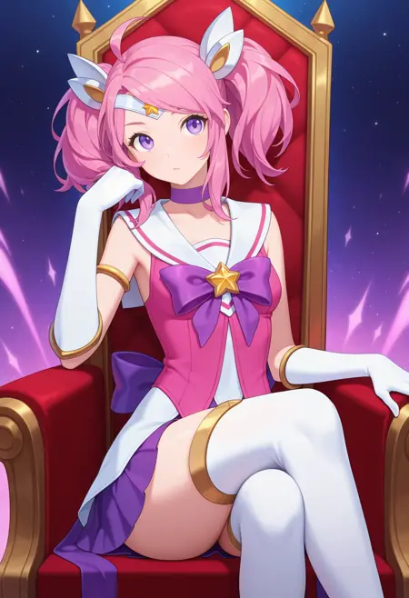 bblux, 粉色头发, 双马尾, 天线头, 皇冠, 紫色眼睛, 紫色项圈, 白色水手领, 紫色蝴蝶结, 粉色衬衫, 手镯, 肘部手套, 白色手套, 紫色裙子, 背部蝴蝶结, 白色过膝袜, 膝上长靴