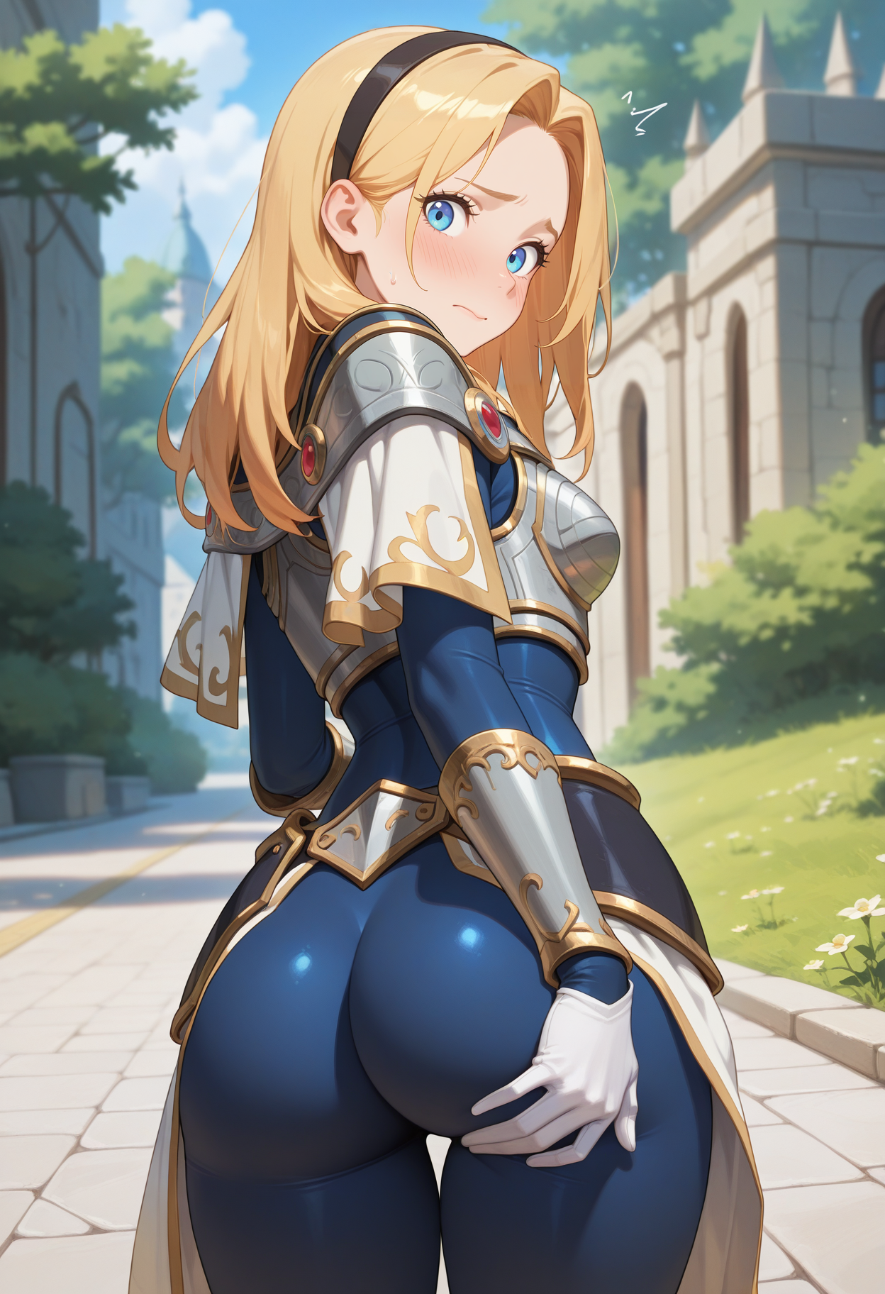 aalux, 长发, 金色头发, 黑色发带, 蓝色眼睛, 肩部护甲, 蓝色紧身衣, 紧身贴肤, 乳环护甲, 长袖, 手臂护甲, 白色手套, 裤裆