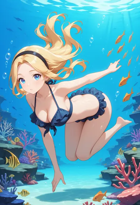 aalux, 长发, 金色头发, 黑色发带, 蓝色眼睛, 锁骨, 蓝色紧身衣, 紧身贴肤