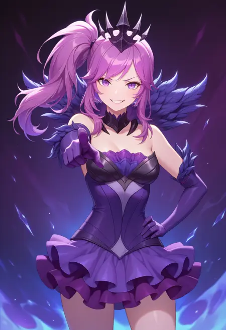 ddlux, 长发, 紫色头发, 侧马尾, 王冠, 紫色眼睛, 黑色衣领, 羽毛镶边, 裸露肩膀, 护甲, 无肩带连衣裙, 紫色连衣裙, 肘部手套, 紫色手套, 绒褶裙边, 紫色裙子