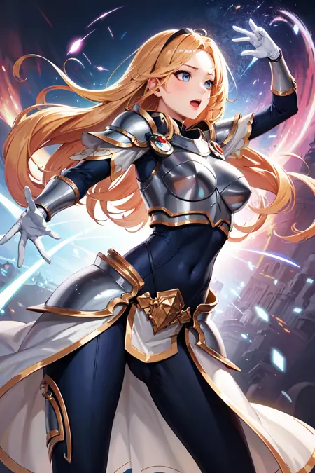 outfit1aalux, long hair, blonde hair, black hairband, blue eyes, shoulder armor, blue bodysuit, skin tight, boobplate, long sleeves, arm guards, white gloves, faulds