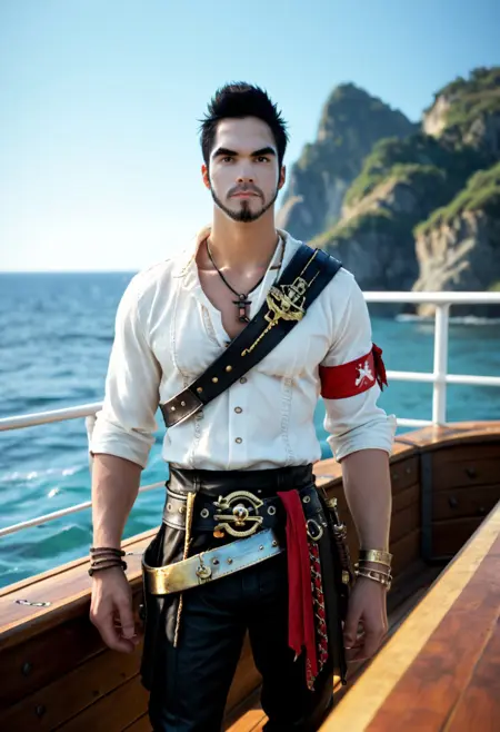 Pirate outfit: pirate outfit, belt over chest, bare chest, black pants, black boots, red armband, bracelets /