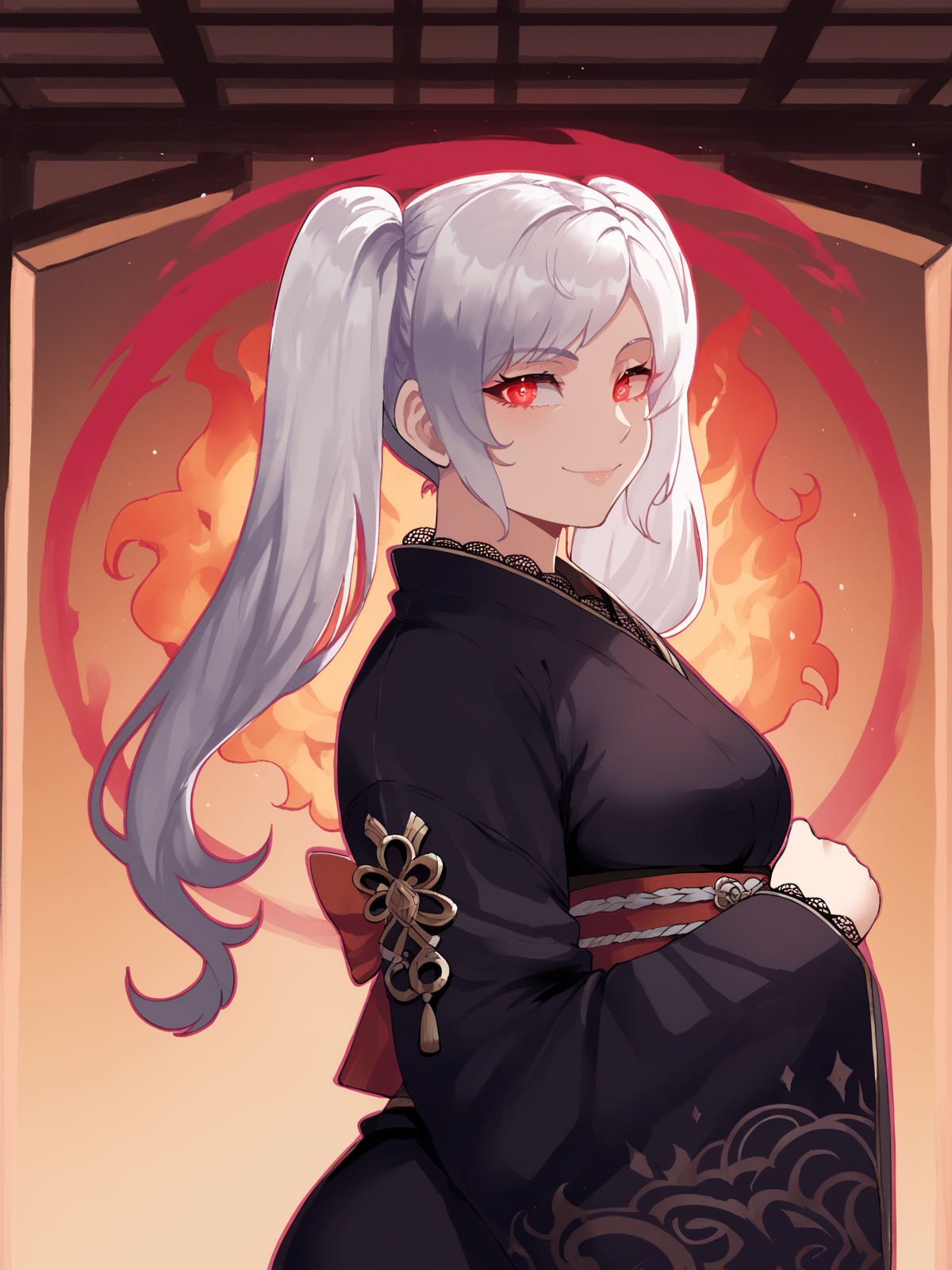 トリガー文は:Grima, robin (fire emblem) (female), red eyes, dark persona, glowing eyes, hooded robe