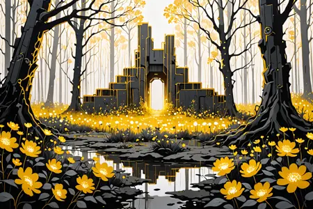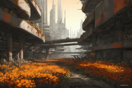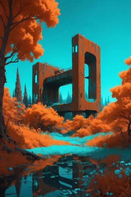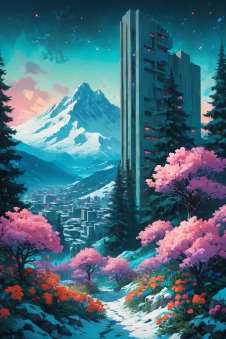 一个专注于将粗野主义建筑与色彩斑斓的茂盛植被结合,以创建优美背景概念的LoRA
